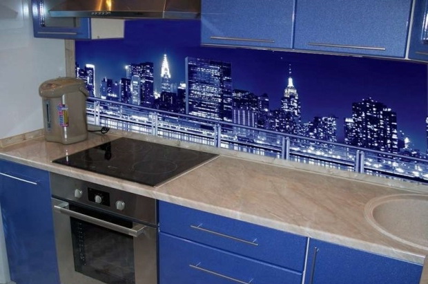 Если как вариант фона вы выбрали фотообои, то при их приклеивании на стену, не забудьте сделать напуски в 5–6 см. снизу и сверху края фартука. Под вытяжкой и над варочной поверхностью элемент фартука закрепите при помощи П-образных профилей из алюминия, а само стекло аккуратно вставьте сбоку в профили. При помощи шурупов, прикрепите к навесным шкафам Г-образный профиль, а затем вставьте в него стеклянные панели. Нижний край закрепите плинтусом или столешницей.